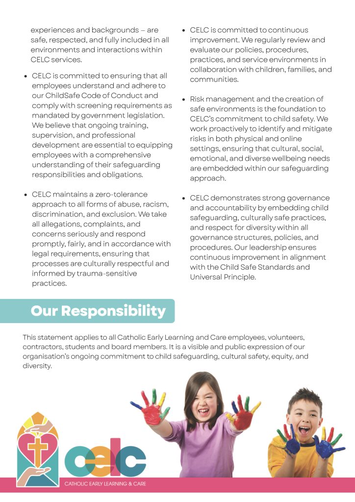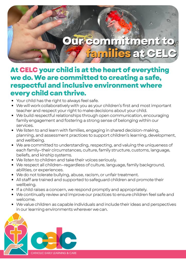 On this page you’ll find our Statement of Commitment to Child Safeguarding and Wellbeing in several versions – so children, families, staff, and community members can read and understand it in the way that suits them best. If you ever have a question or worry about child safety at Centacare FNQ, please reach out to our Executive Officer Anita Veivers on 40 440 130 or email admin@ccelc.catholic.org.au